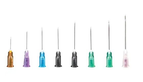 Agulha hipodérmica descartável estéril embalada unitariamente.
