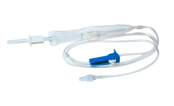 Equipo de transfusão de sangue, com filtro de sangue, câmea duupla de gotejamento, tubulação em, PVC de 150cm, regulador de fluxo tipo V e encaixe luer lock (rosca) - Solidor Ref. 487